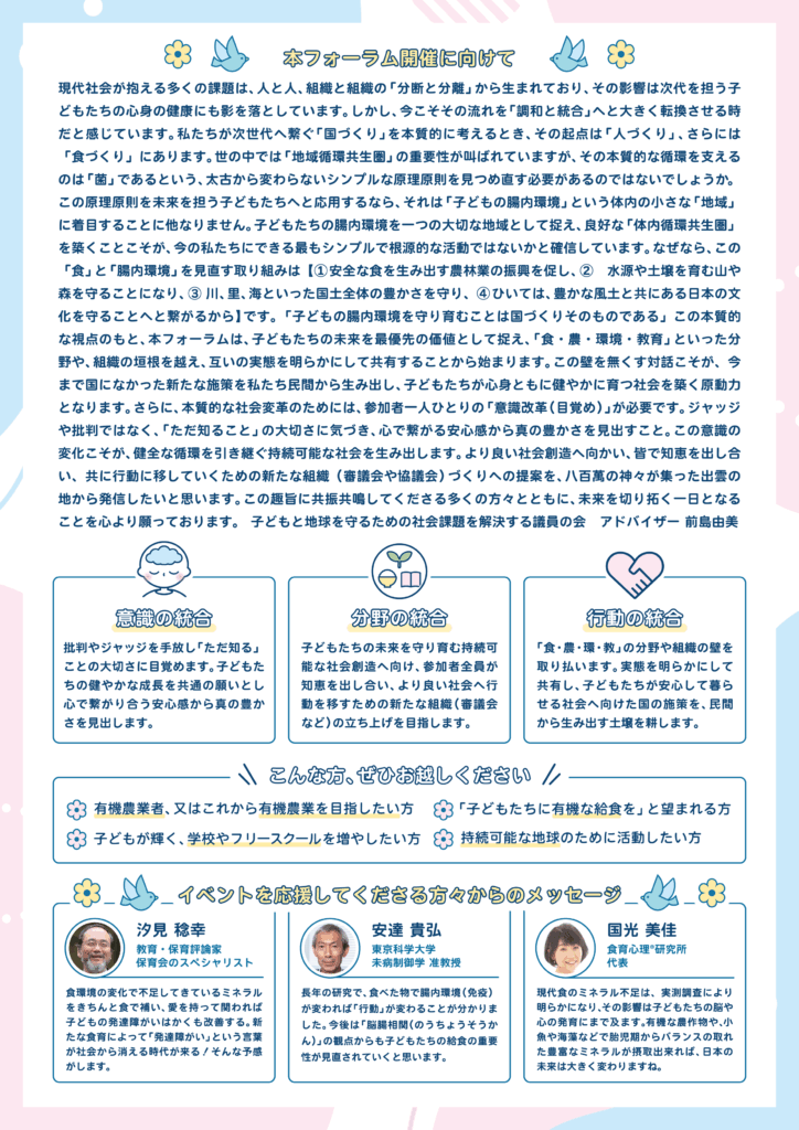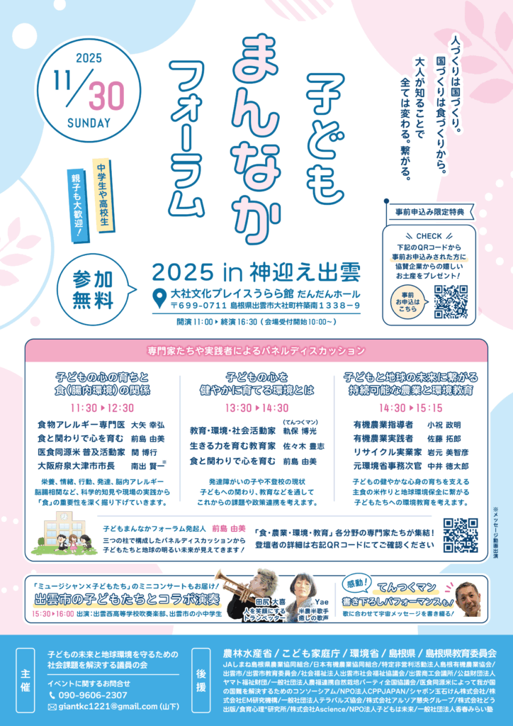 名称 子どもまんなかフォーラム ~2025 in 神迎え出雲~ 日時 2025年11月30日(日)11:00〜16:00 会場 大社プレイスうらら館(だんだんホール)(島根県出雲市) 参加費 無料 主催 子どもの未来と地球環境を守るための社会課題を解決する議員の会 お申し込みは こちら から
